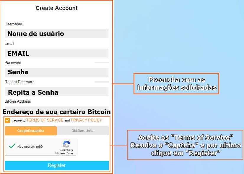 Após completar os passos acima, basta aceitar os TERMS OF SEVICE and PRIVACY POLICY, depois resolver o “Captcha” e por último clicar no botão azul escrito “Register”, logo em seguida será enviado um link de confirmação de conta para seu e-mail, basta clicar nele que sua conta estará pronta para começar a ganhar várias frações de Bitcoin grátis.