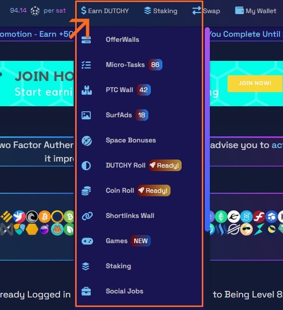 Você vai encontrar diversas opções de ganhos no Final Autoclaim, para acessa-las clique na opção “Earn DUTCH” localizada no menu superior, logo em seguida vai descer uma aba com todas as formas de ganhos disponíveis, abaixo vamos explicar as principais.
